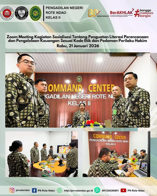 HUMAS PN ROTE NDAO : Pada hari Rabu, 21 Januari 2026, Ketua Pengadilan Negeri Rote Ndao, Ibu Fransiska Dari Paula Nino, S.H., M.H. mengikuti Sosialisasi tentang Penguatan Literasi Perencanaan dan Pengelolaan Keuangan sesuai Kode Etik dan Pedoman Perilaku Hakim bersama Wakil Ketua dan Para Hakim. Kegiatan ini diselenggarakan oleh Pengurus Pusat Ikatan Hakim Indonesia (PP IKAHI) mengangkat tema penguatan literasi perencanaan dan pengelolaan keuangan sesuai kode etik dan pedoman perilaku hakim secara daring melalui Zoom Meeting di Command Center Pengadilan Negeri Rote Ndao.