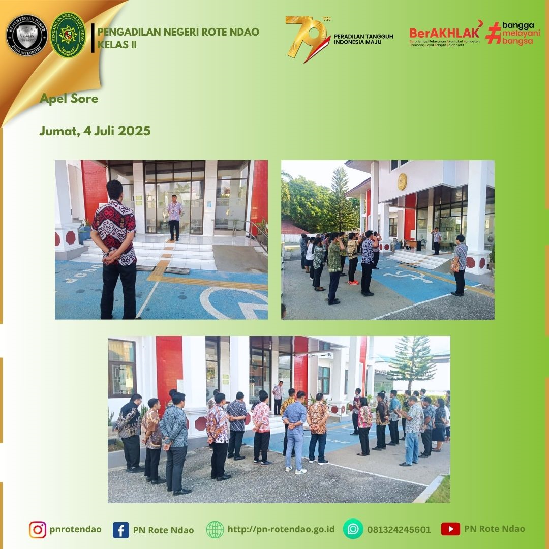 HUMAS PN ROTE NDAO : Pada hari Jumat, 4 Juli 2025 bertempat di Drop Zone Pengadilan Negeri Rote Ndao diadakan kegiatan Apel Sore yang dipimpin oleh Hakim Pengadilan Negeri Rote Ndao, Bapak Soleman Dairo Tamaela, S.H., M.Hum. dan diikuti oleh Panitera, Sekretaris serta seluruh Pejabat Struktural & Fungsional, Pelaksana serta PPNPN Pengadilan Negeri Rote Ndao.