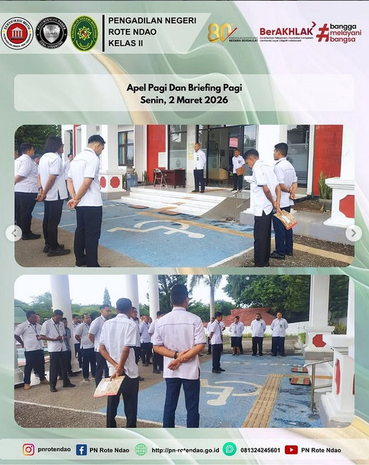 PN ROTE NDAO - HUMAS : Pada hari Senin, 2 Maret 2026, bertempat di Lobby Pengadilan Negeri Rote Ndao diadakan kegiatan Apel Pagi yang dipimpin oleh Wakil Ketua Pengadilan Negeri Rote Ndao, I Gede Susila Guna Yasa, S.H., M.H. diikuti oleh Para Hakim, Sekretaris serta seluruh Pejabat Struktural & Fungsional, Pelaksana serta PPNPN Pengadilan Negeri Rote Ndao.