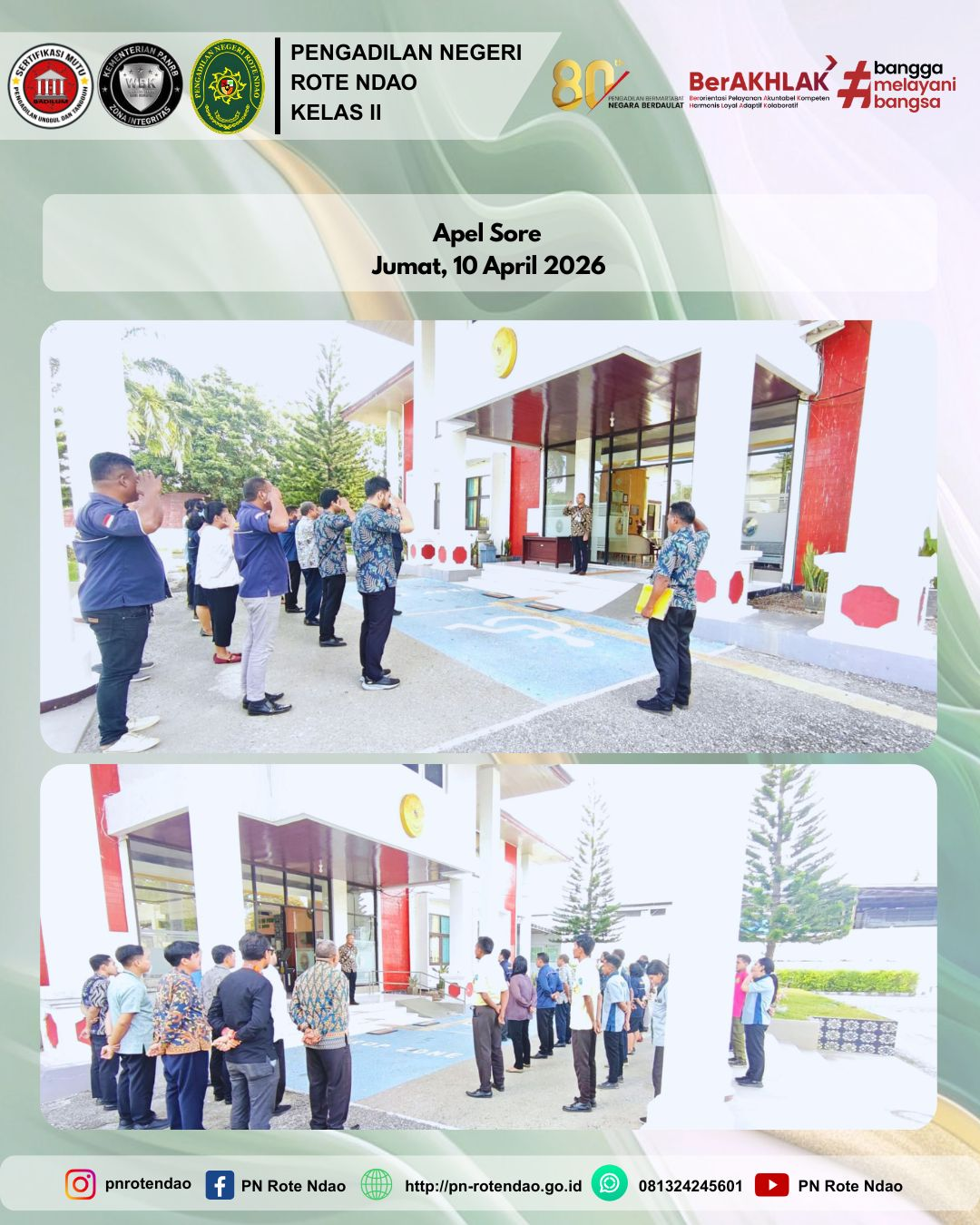 HUMAS PN ROTE NDAO : Pada hari Jumat, 10 April 2026 bertempat di Drop Zone Pengadilan Negeri Rote Ndao diadakan kegiatan Apel Sore yang dipimpin oleh Wakil Ketua Pengadilan Negeri Rote Ndao, Bapak I Gede Susila Guna Yasa, S.H., M.H. dan diikuti oleh Sekretaris serta seluruh Pejabat Struktural & Fungsional, Pelaksana serta PPNPN Pengadilan Negeri Rote Ndao.
