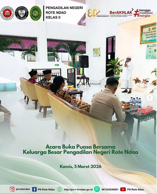 PN ROTE NDAO - HUMAS : Pada hari Kamis, 5 Maret 2025, Ketua Pengadilan Negeri Rote Ndao, Ibu Fransiska Dari Paula Nino, S.H., M.H., bersama Para Hakim, Sekretaris, Panitera, Pejabat Struktural & Fungsional, Pelaksana serta PPNPN Pengadilan Negeri Rote Ndao dan Dharmayukti Karini Pengadilan Negeri Rote Ndao melaksanakan kegiatan Buka Puasa Bersama. Kegiatan ini merupakan bentuk syukur dan menjadi pengingat untuk seluruh anggota Keluarga Besar Pengadilan Negeri Rote Ndao untuk memberikan yang terbaik dalam pekerjaan dan keluarga.