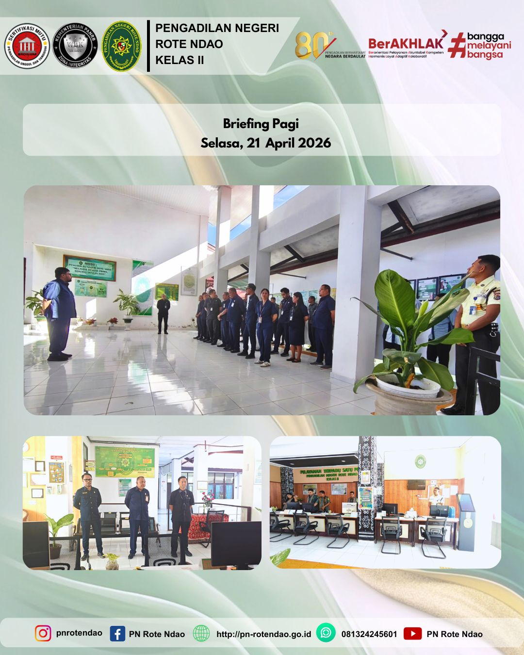 PN Rote Ndao-Humas: Pada hari Selasa, 21 April 2026, bertempat di Lobby Pengadilan Negeri Rote Ndao diadakan kegiatan doa bersama, program semangat pagi, kegiatan briefing PTSP, Kepaniteraan dan Kesekretariatan yang dipimpin oleh Hakim Pengadilan Negeri Rote Ndao, Bapak Muhammad Kafri Pratama, S.H. dan diikuti oleh Para Hakim, Panitera, Sekretaris, Pejabat Struktural & Fungsional, Pelaksana serta PPPK Pengadilan Negeri Rote Ndao.