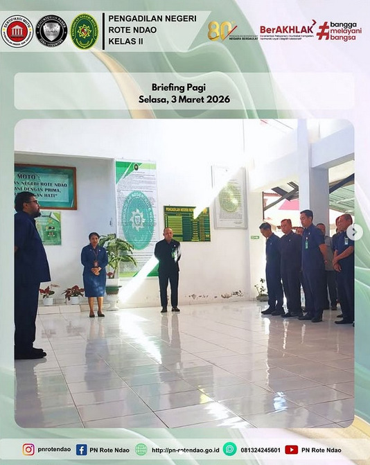 PN Rote Ndao-Humas: Pada hari Selasa, 3 Maret 2026, bertempat di Lobby Pengadilan Negeri Rote Ndao diadakan kegiatan doa bersama, program semangat pagi, kegiatan briefing PTSP, Kepaniteraan dan Kesekretariatan yang dipimpin oleh Hakim Pengadilan Negeri Rote Ndao, Bapak Muhammad Kafri Pratama, S.H. dan diikuti oleh Para Hakim, Panitera, Sekretaris, Pejabat Struktural & Fungsional, Pelaksana serta PPPK Pengadilan Negeri Rote Ndao.
