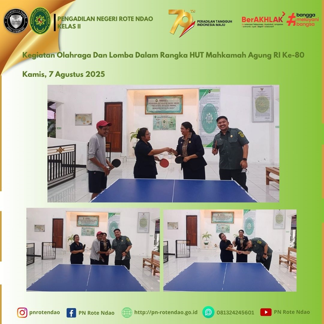 Kegiatan lomba tenis meja dengan sistem gugur diikuti seluruh warga Pengadilan Negeri Rote Ndao dengan antusias. Dengan kegiatan perlombaan ini diharapkan dapat menjadi penyegar dan menumbuhkan kebersamaan dan kekompakan.