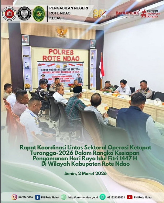 PN ROTE NDAO - HUMAS : Pada hari Senin, 2 Maret 2026, Ketua Pengadilan Negeri Rote Ndao yang diwakilkan oleh Bapak Reza Reagan, S.H., mengikuti Kegiatan Rapat Koordinasi Lintas Sektoral Operasi Ketupat Turangga Tahun 2026 dalam rangka Hari Raya Idul Fitri 1447 H di Kabupaten Rote Ndao. Undangan kegiatan ini dihadiri oleh segenap Pejabat Daerah Kabupaten Rote Ndao dan Pimpinan Forkopimda.