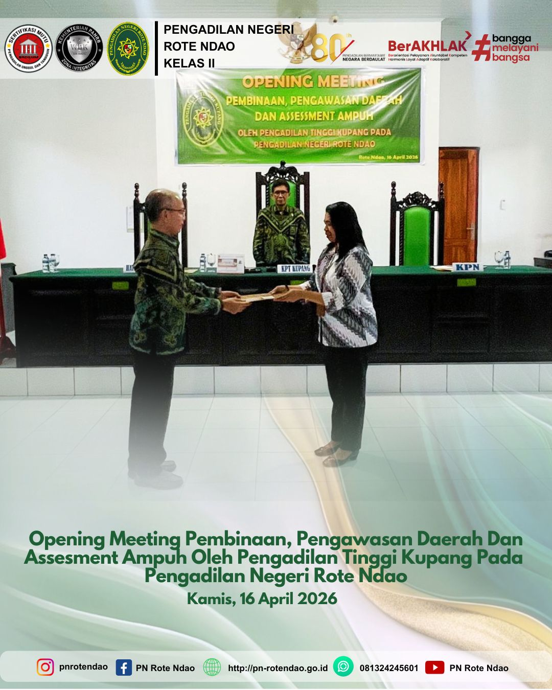 PN ROTE NDAO - HUMAS : Pada Kamis, 16 April 2026 dan Jumat, 17 April 2026, YM. Ketua Pengadilan Tinggi, Bapak Aviantara, S.H., M.Hum., bersama Hakim Tinggi Pengawas Daerah, YM. Bapak Sutikna, S.H., M.H., YM Suparman, S.H., M.H., Dr. Drs. Anis Busroni, S.H., M.Hum. membuka Pembinaan dan Pengawasan Daerah pada Pengadilan Negeri Rote Ndao. Dalam kesempatan tersebut, Ketua Pengadilan Negeri Rote Ndao Ibu Fransiska Dari Paula Nino, S.H., M.H. menyampaikan pencapaian kinerja di bagian Kepaniteraan dan Kesekretariatan.