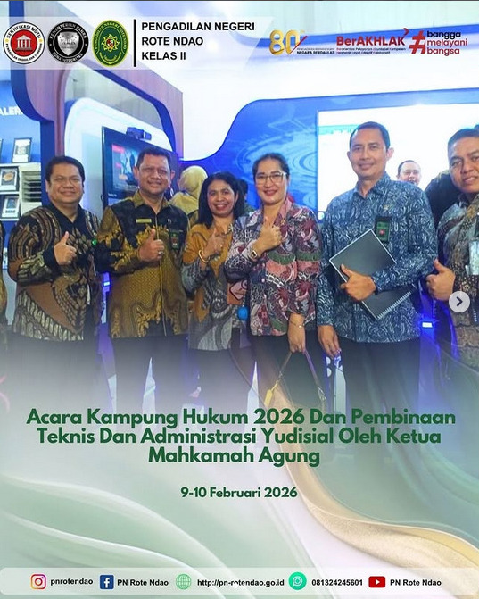 PN Rote Ndao-Humas: Pada hari Senin, 9 Februari 2026 dan Selasa, 10 Februari 2026, Area Parkir Barat Gedung Mahkamah Agung RI, Pameran Kampung Hukum diselenggarakan selama 2 hari. Dalam pameran yang dibuka langsung oleh Ketua Mahkamah Agung RI, Y.M. Prof. Dr. H. Sunarto, S.H., M.H. Peserta internal terdiri dari Kepaniteraan Mahkamah Agung, Badilum, Badilag, Badilmiltun, Bawas, Litbangkumdil, BUA, IKAHI, dan IPASPI. Selain itu juga hadir 30 Kementerian dan lembaga, organisasi non pemerintah (NGO), mitra perbankan dan mitra kerja Mahkamah Agung lainnya. Dalam pameran tersebut, Ketua Pengadilan Negeri Rote Ndao, Ibu Fransiska Dari Paula Nino, S.H., M.H. mengikuti kegiatan mengikuti seminar, talkshow, dan kegiatan edukatif lain yang menghadirkan pengalaman belajar hukum secara langsung. Para pengunjung yang terdiri dari hakim, pegawai pengadilan, mahasiswa dan masyarakat umum dapat langsung melihat berbagai kebijakan, inovasi, dan capaian kinerja di bidang hukum dan pelayanan publik melalui booth pameran.