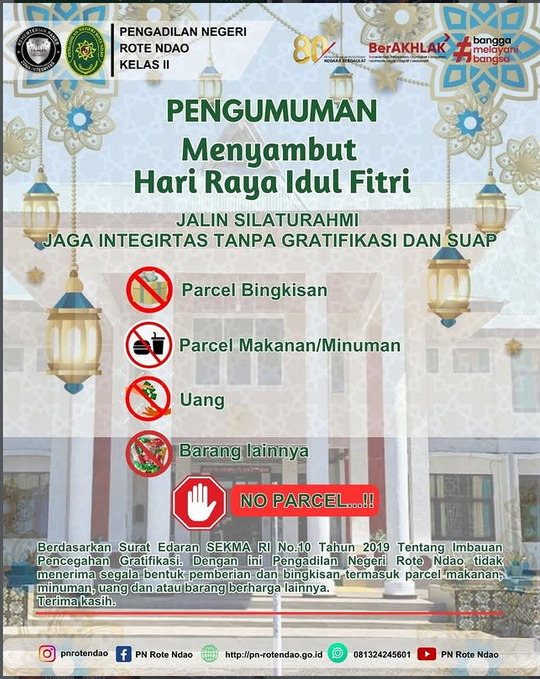 Dalam rangka menjaga integritas dan mencegah gratifikasi, Pengadilan Negeri Rote Ndao tidak menerima pemberian dalam bentuk apa pun, termasuk parcel, uang, makanan/minuman, maupun barang berharga lainnya terkait Hari Raya.