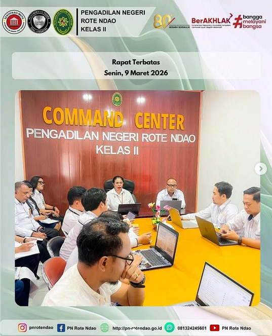 PN ROTE NDAO - HUMAS : Pada hari Senin, 9 Maret 2026, Ketua Pengadilan Negeri Rote Ndao, Ibu Fransiska Dari Paula Nino, S.H., M.H. memimpin Rapat Terbatas bersama Wakil Ketua, Para Hakim, Panitera, Sekretaris, Para Kasubbag, Para Panmud dan Pejabat Fungsional terkait kinerja dan kendala Pengadilan Negeri Rote Ndao di ruang Command Center Pengadilan Negeri Rote Ndao.