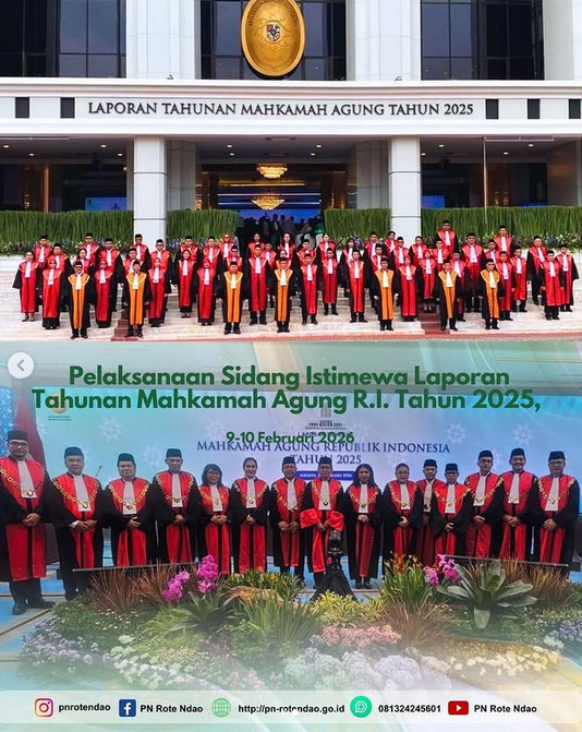 PN Rote Ndao-Humas: Pada hari Selasa, 10 Februari 2026, bertempat di Gedung Mahkamah Agung, Jakarta dilaksanakan Sidang Istimewa Laporan Tahunan (Laptah) Mahkamah Agung Tahun 2024 yang dipimpin oleh Prof. Dr. H. Sunarto, S.H., M.H. Laporan tahunan ini adalah adalah bentuk pertanggungjawaban Mahkamah Agung dan Badan Peradilan di bawahnya sebagai lembaga yudikatif. Dalam laporannya, Ketua Mahkamah Agung RI memaparkan capaian kinerja, seperti peningkatan putusan perkara, minutasi tepat waktu, tantangan, dan inovasi peradilan berintegritas. Salah satu pendorong utamanya adalah masifnya penerapan pengajuan kasasi dan peninjauan kembali (PK) secara elektronik. Digitalisasi ini dinilai mampu memangkas birokrasi pengiriman berkas fisik yang selama ini memakan waktu dan biaya tinggi.