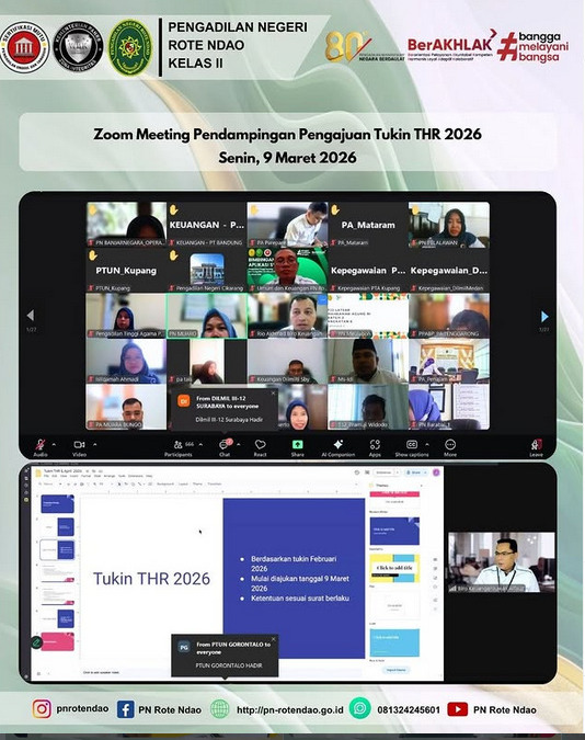 PN ROTE NDAO - HUMAS : Pada hari Senin, 9 Maret 2026, Kepala Sub Bagian Umum dan Keuangan, Bapak John Yersi Timneno, S.H. mengikuti zoom meeting mengenai Pendampingan Pengajuan Tukin THR oleh Biro Keuangan MA RI. Adapun tujuan pendampingan tersebut adalah untuk menyamakan persepsi dalam pengajuan dan pencairan Tukin THR.