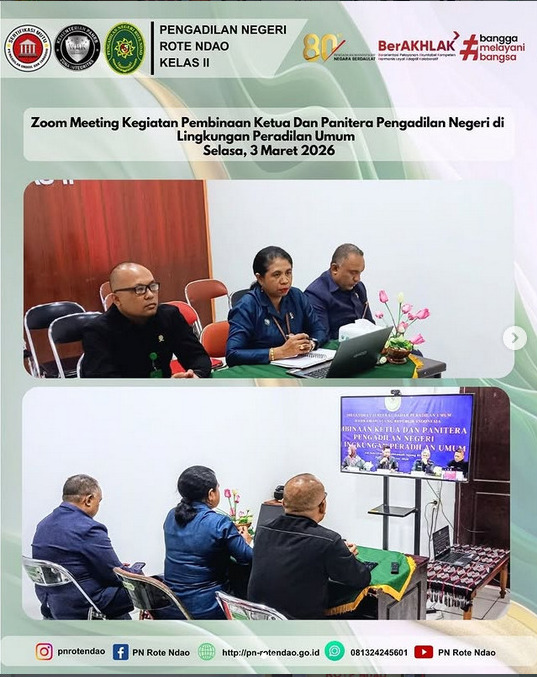 PN ROTE NDAO - HUMAS : Pada hari Selasa, 3 Maret 2026, Ketua Pengadilan Negeri Rote Ndao, Ibu Fransiska Dari Paula Nino, S.H., M.H. bersama Wakil Ketua dan Panitera mengikuti Zoom Meeting Pembinaan Ketua dan Panitera Pengadilan Negeri di Lingkungan Peradilan Umum secara virtual melalui aplikasi zoom pada Command Center Pengadilan Negeri Rote Ndao.