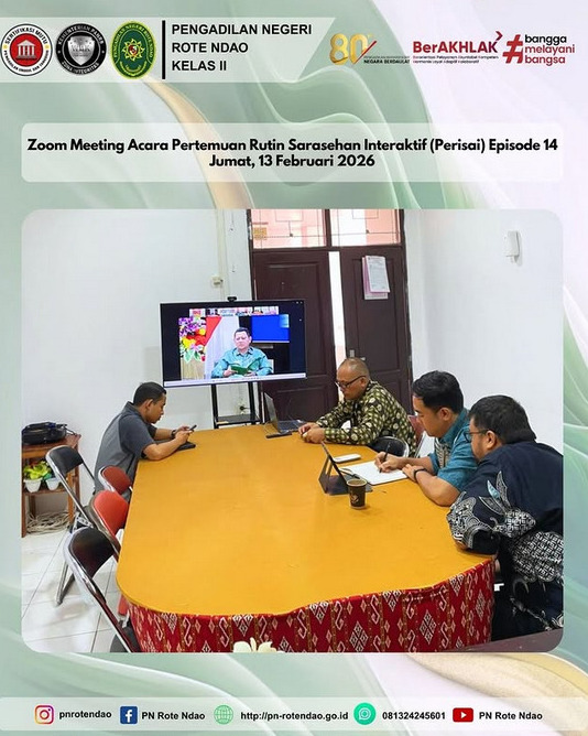 HUMAS PN ROTE NDAO : Pada hari Jumat, 13 Februari 2026, Ketua Pengadilan Negeri Rote Ndao mengikuti Pertemuan Rutin Sarasehan Interaktif (Perisai) Episode 14 secara terpisah bersama Wakil Ketua dan seluruh Hakim Pengadilan Negeri Rote Ndao dengan tema “Hukum Pembuktian dalam Perspektif KUHAP Baru” dengan narasumber dari YM Sutarjo, S.H., M.H., Hakim Agung Mahkamah Agung RI, serta Dr. Fachrizal Afandi, S.Psi., S.H., M.H., seorang akademisi hukum pidana dari Fakultas Hukum Universitas Brawijaya secara daring melalui Zoom Meeting di Command Center Pengadilan Negeri Rote Ndao.