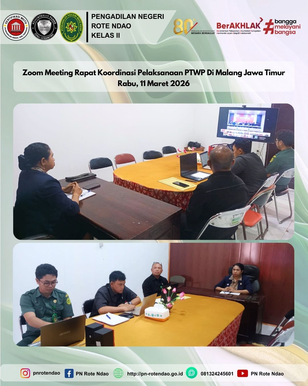 PN ROTE NDAO - HUMAS : Pada Rabu, 11 Maret 2026, Ketua Pengadilan Negeri Rote Ndao, Ibu Fransiska Dari Paula Nino, S.H., M.H. bersama Bapak Felix Aldi Anggoro Jati, S.H., M.H. sebagai pengurus PTWP Cabang Rote Ndao mengikuti Zoom Meeting Rapat Koordinasi Pengurus Daerah PTWP Daerah NTT secara daring pada Command Center Pengadilan Negeri Rote Ndao dengan kegiatan pembahasan rancangan anggaran biaya untuk kontingen NTT pada pelaksanaan Kejuaraan Nasional Turnamen Tenis Beregu Piala Ketua Mahkamah Agung Tahun 2026 bulan Juni di Malang, Jawa Timur.