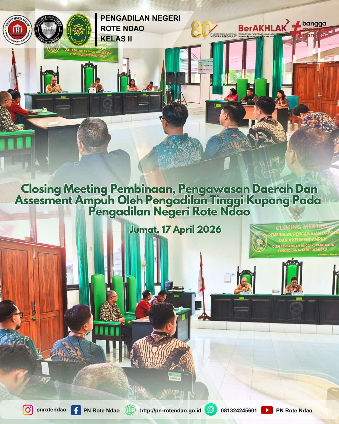 Pada hari Jumat, 17 April 2026, YM. Ketua Pengadilan Tinggi, Bapak Aviantara, S.H., M.Hum., bersama Hakim Tinggi Pengawas Daerah, YM. Bapak Sutikna, S.H., M.H., YM Suparman, S.H., M.H., Dr. Drs. Anis Busroni, S.H., M.Hum. dan Ketua Pengadilan Negeri Rote Ndao, Ibu Fransiska Dari Paula Nino, S.H., M.H. membuka Closing Meeting Pembinaan dan Daerah pada Pengadilan Negeri Rote Ndao.