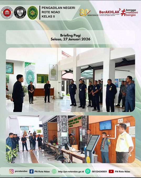 PN Rote Ndao-Humas: Pada hari Selasa, 27 Januari 2026, bertempat di Lobby Pengadilan Negeri Rote Ndao diadakan kegiatan doa bersama, program semangat pagi, kegiatan briefing PTSP, Kepaniteraan dan Kesekretariatan yang dipimpin oleh Hakim Pengadilan Negeri Rote Ndao, Bapak Felix Aldi Anggoro Jati, S.H., M.H. dan diikuti oleh Para Hakim, Panitera, Sekretaris, Pejabat Struktural & Fungsional, Pelaksana serta PPPK Pengadilan Negeri Rote Ndao.