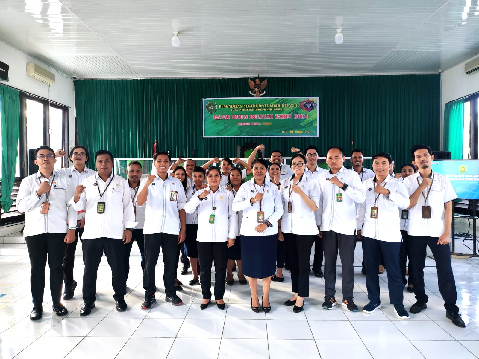 Pada hari Senin, 22 Januari 2024, bertempat di ruang sidang Garuda Pengadilan Negeri Rote Ndao, dilakukan agenda rutin rapat bulanan yang dipimpin langsung oleh Ketua Pengadilan Negeri Rote Ndao, Ibu Fransiska Dari Paula Nino, S.H., M.H. dan diikuti Seluruh Hakim, Panitera, Sekretaris, Pejabat Struktural & Fungsional, Pelaksana serta PPNPN Pengadilan Negeri Rote Ndao. Dalam arahannya Ketua Pengadilan Negeri Rote Ndao menyampaikan agar dalam melaksanakan pekerjaan seluruh warga Pengadilan Negeri Rote Ndao tetap mengacu pada Perma Nomor 7,8 dan 9 Tahun 2016 serta SK KMA Nomor 1 tahun 2017. Selain itu dibahas mengenai kendala-kendala dan tindaklanjut yang ada di laporan bulanan kepaniteraan dan kesekretariatan pada Pengadilan Negeri Rote Ndao, diberikan juga penghargaan kepada Hakim dengan Minutasi terbaik kepada Bapak Bapak Dimas Indra Swadana.SH., Panitera Pengganti dengan Minutasi terbaik kepada Bapak Paulus Bire Kire, S.H., Pegawai Teladan kepada Bapak John Yersi Timneno. S.E., Petugas Pelayanan Publik Terbaik kepada Sdr. David Christian. S.H., PPNPN Teladan kepada Bapak.Jemi A. A. Anabokai Serta ruangan dengan penerapan 5R terbaik kepada ruang Kepaniteraan Perdata.