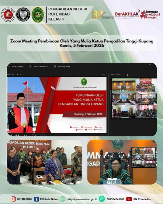 PN ROTE NDAO - HUMAS : Pada hari Kamis, 5 Februari 2026, Ketua Pengadilan Negeri Rote Ndao, Ibu Fransiska Dari Paula Nino, S.H., M.H. bersama Para Hakim, Panitera, Sekretaris, Pejabat Struktural dan Fungsional, mengikuti Zoom Meeting Pembinaan oleh Pengadilan Tinggi Kupang secara virtual melalui aplikasi zoom pada Command Center Pengadilan Negeri Rote Ndao.